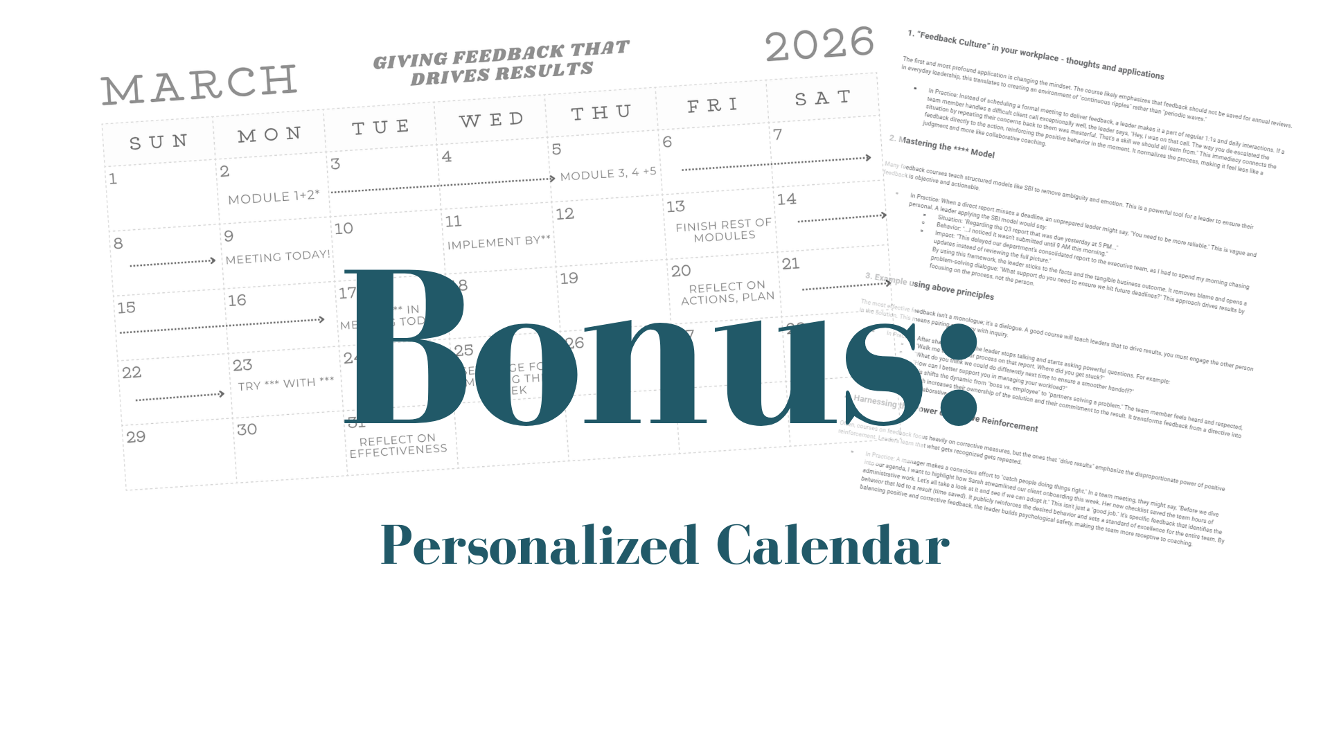Don't let this course become just another set of notes in a folder. Master management you need to apply principles consistently. That's why I'm including three months of personalized calendars, tailored to your needs and situation. This promotion won't last long so sign up today and lock in this great bonus!