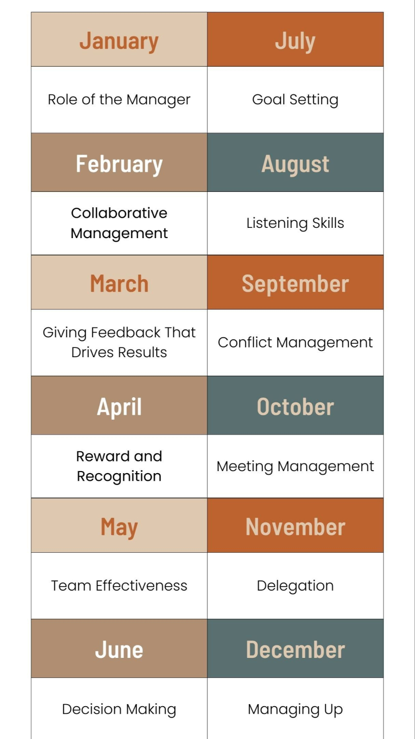 Please note that Conflict Management, Meeting Management, Delegation and Managing Up are instead taught in-person with no online course.
